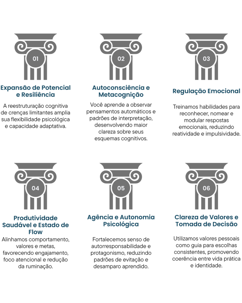 O objetivo é que, progressivamente, você desenvolva habilidades de autoterapia, tornando-se capaz de aplicar os aprendizados fora do setting clínico.