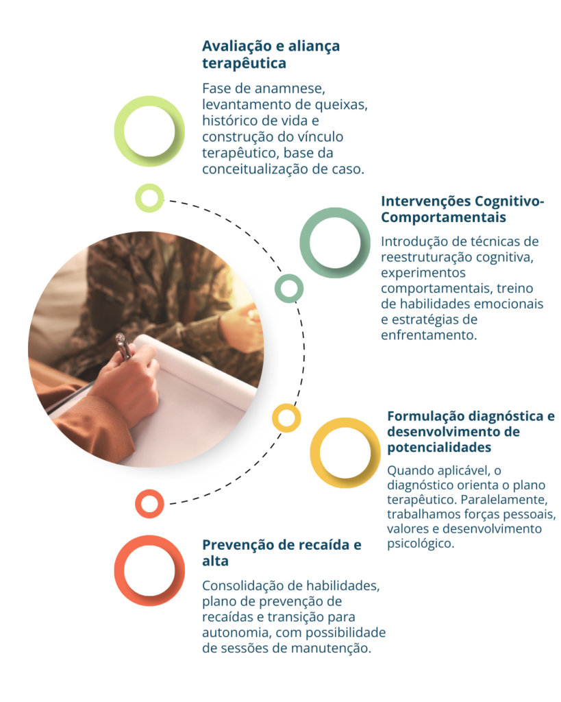 Ao longo do processo, desenvolvemos uma conceitualização cognitiva de caso, um modelo individualizado que organiza a relação entre pensamentos, emoções, comportamentos, respostas fisiológicas e experiências de vida.